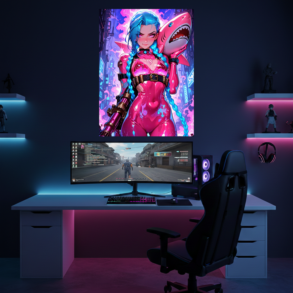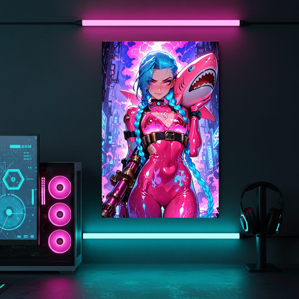 Chaos has never been so aesthetically pleasing. This Jinx edition utilizes liquid neon optics to capture the chemical madness of Zaun. The metallic surface of the Displate makes the blue neon braids and mechanical details of "Fishbones" shimmer with a metallic sheen. The aluminum Dibond ensures that the explosive particle effects in the background develop incredible dynamism.