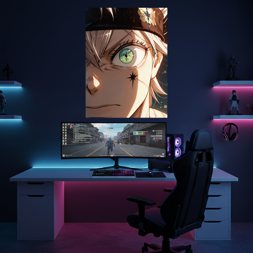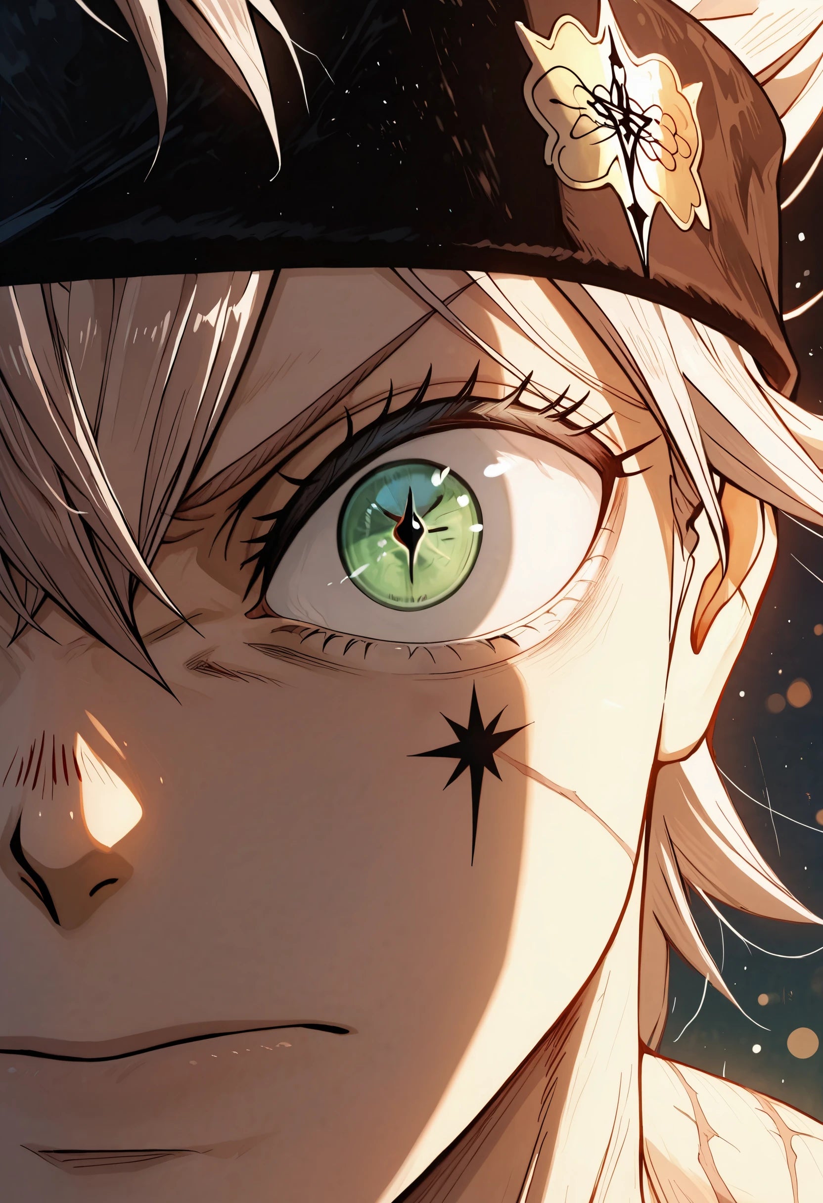 Detailed Black Clover Asta close-up with emerald green eye, star marker, and headband on a premium metal poster. UV-printed metal wall art, scratch-resistant and frameless – ideal for Asta fans! High-quality anime metal print, Black Clover Eye fan art.