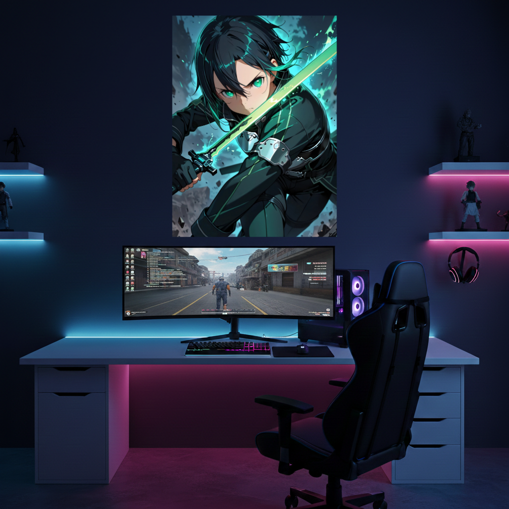 The real star of this artwork is the print quality on aluminium : The electrifying neon green of the blade and his eyes practically glows against the deep black, metallic background. The flying particles and the sharp edges of his armor appear razor-sharp and almost three-dimensional thanks to the HD printing. 💎 An absolute statement piece for fans who love the cyberpunk look of SAO.