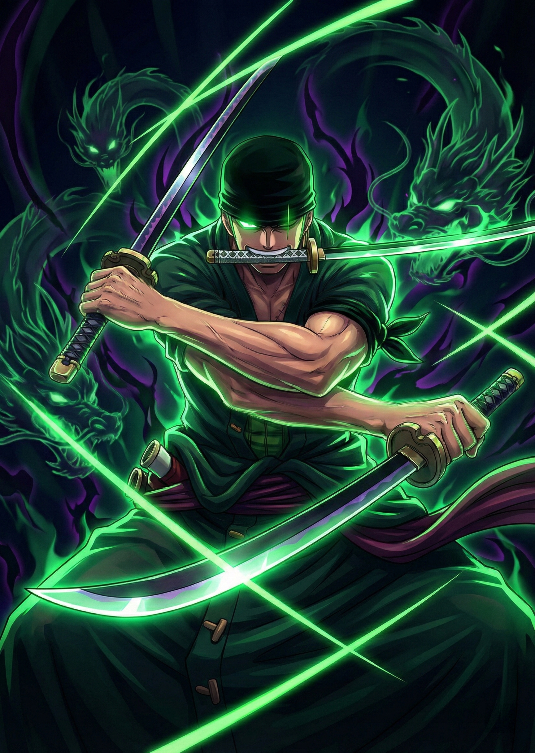The artwork captures Zoro in his iconic fighting stance, while the power of his blades illuminates the room in vibrant neon greens. The metallic surface of the aluminum Dibond enhances the light reflections on the katanas, creating a luxurious depth effect with an industrial-chic aesthetic . This wall art statement is an essential highlight for any professional gaming setup or modern living space.