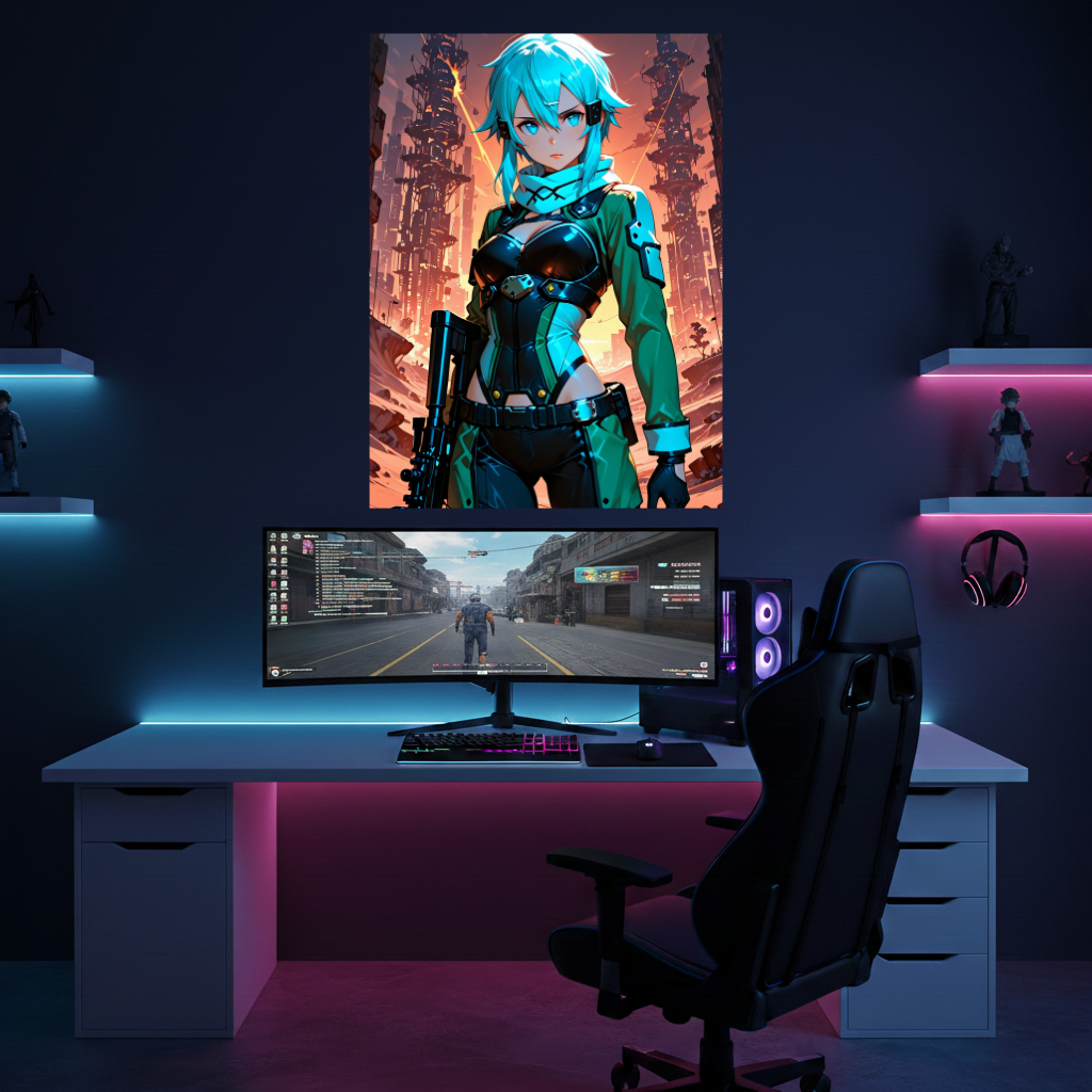 Precision meets metallic perfection! 🎯 Experience Sinon in the harsh world of Gun Gale Online. This metal displate captures the sharpshooter's cool determination in vibrant teal and orange tones. 🏜️✨ Thanks to the special coating on the aluminum Dibond, the mechanical details of her rifle and the dusty atmosphere of the ruins appear incredibly realistic. A powerful statement piece for any gaming setup! 🛡️💎