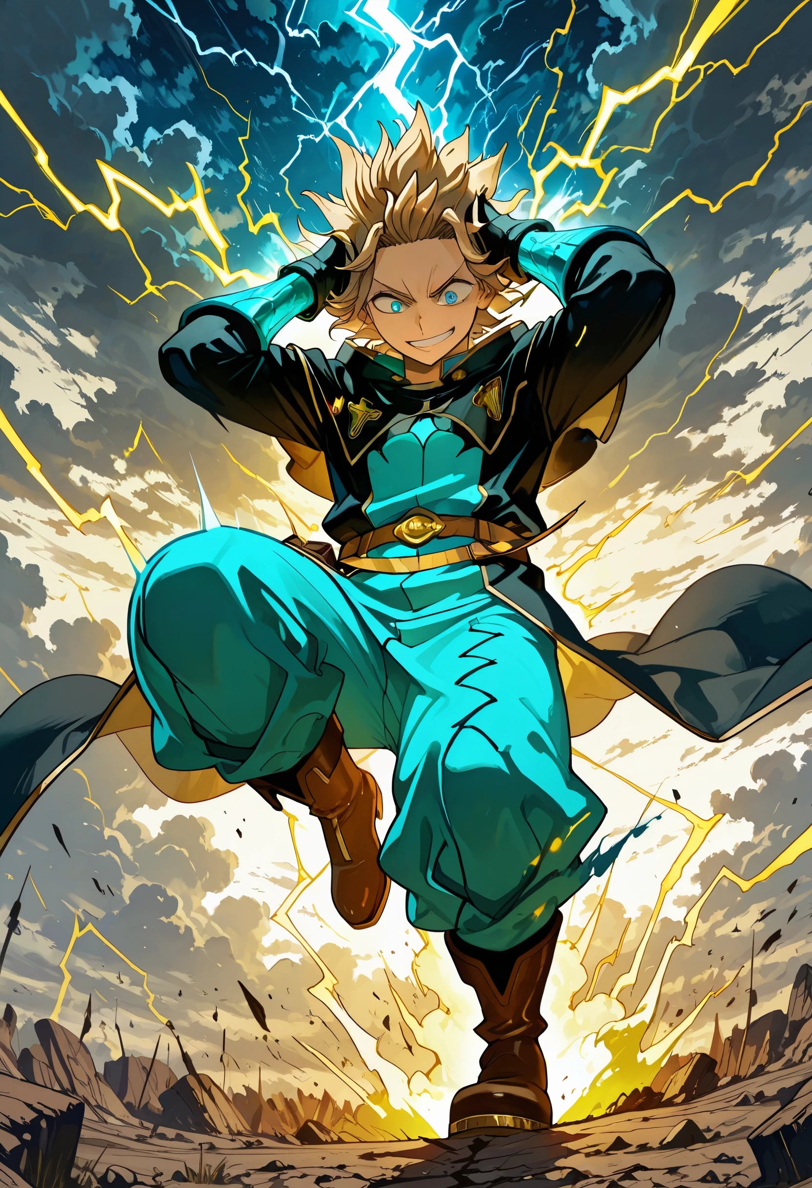 Energetischer Black Clover Luck Voltia mit gelben Blitzen und Battle-Grinsen auf Metall-Poster. Premium Metal Wall Art, langlebig & rahmenlos – perfektes Anime-Display für Fans von Lightning Magic! Hochdetailliertes Fanart Metal Print, Luck Voltia Power-Up.